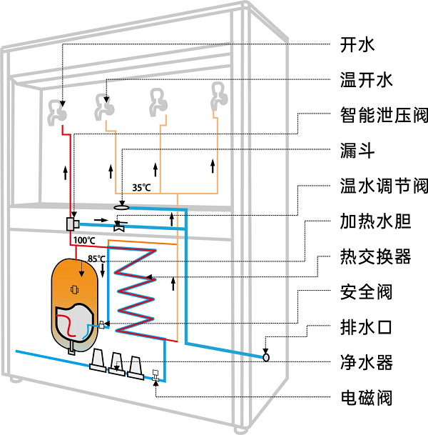 設(shè)備采用節(jié)能熱交換技術(shù),熱損低,更節(jié)能;保溫結(jié)構(gòu)設(shè)計,保溫效果好。多水龍頭布局,有效應(yīng)對飲水量大與飲水集中的問題,確保供水順暢。特別設(shè)計的溫開水出水口,貼心呵護小學生的飲水需求,安全又溫馨。